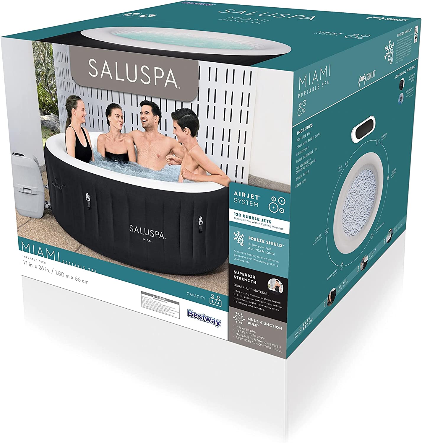 After a long day, there’s nothing more relaxing than sinking into warm, bubbling water right in your own backyard. The SaluSpa® Miami AirJet™ provides a soothing massage experience for up to 4 people, while still being quick and easy to set up. Simply attach the pump and watch as it inflates. Soothing Massage System: The AirJet system features 120 jets which release bubbles from the bottom of the spa to create a warm, bubbling hot tub environment. These soothing bubbles will help you relax and unwind right from the comfort of your home. Durable Construction: This spa’s inflatable walls are made of durable, puncture-resistant, DuraPlus™ material which prevents damage and retains shape after repeated inflation and deflation. The included Freeze Shield™ automatic heating function prevents inner components from freezing during colder temperatures ensuring you can enjoy your spa year after year. Contents: Equipped with a pump that quickly inflates the spa, heats it up, runs filtration and controls the massage system, this spa is both easy and convenient. The pump can easily be reached from inside the spa and features cup holders for drinks and snacks. Also included is a ChemConnect™ dispenser that maintains clean, healthy water by evenly dispersing the proper amount of chlorine. To top it all off, the Miami spa comes with a reinforced cover that locks in heat while not in use, as well as keeping dust and debris from collecting on the water.