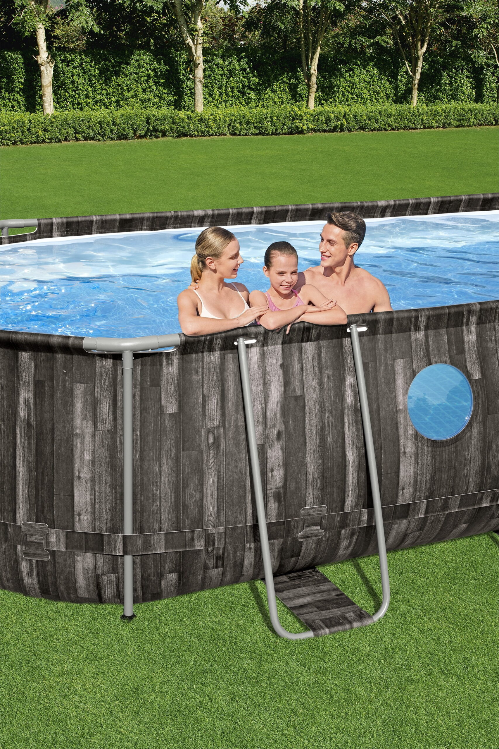 The Coleman® Power Steel™ Swim Vista Series™ II is the second generation of the first ever pool with built-in portholes! Back and better than ever, the Swim Vista Series offers a truly unique pool experience. Swim Vista Portholes: With reinforced, fortified portholes built into the sides of the oval pool, swimmers can wave and make silly faces as they paddle by. These windows also allow parents to easily keep an eye on the kids as they dip and dive underwater. Plus, minimal-tool setup makes this pool a no-brainer. Durable Construction: The durable steel frame is equipped with our Seal & Lock System™ for a sturdy and secure pipe connection. The frame connectors also prevent metal-on-metal contact to ensure corrosion and rust resistance. The sturdy Tritech™ liner is made out of an ultra-durable 3-layer material that is reinforced for strength and puncture-resistance. Tritech is 15% more tear resistant, 33% more stretch resistant and 83% more puncture resistant than standard PVC, ensuring your pool will last summer after summer. Additional Features: This above ground pool set also comes stocked with a filter pump and a ladder.