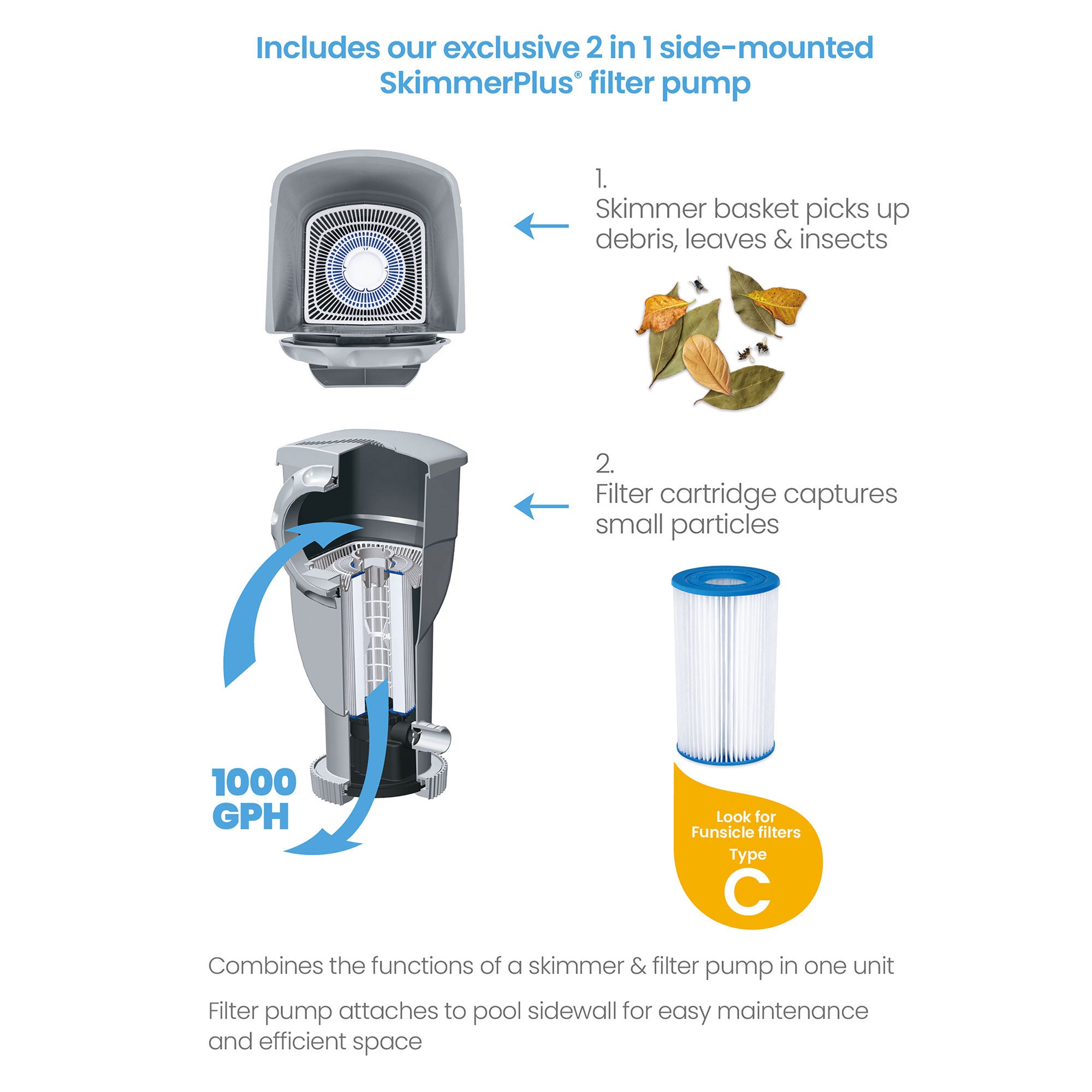 • Includes a 110 to 120-volt SkimmerPlus SKX1000 filter pump with GFCI and type C filter cartridge for easy maintenance, SureStep ladder for a safe entry and exit, a protective pool cover, ground cloth, and a Deluxe Maintenance kit