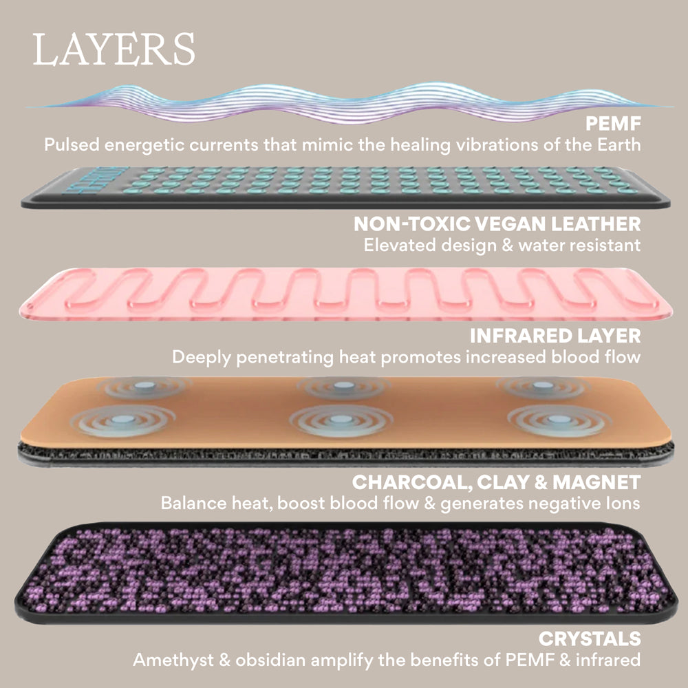 The mats are built with a thick layer of 100% natural purple amethyst crystals in mesh fabric tubes across the entire mat. The amethyst and tourmaline layers provide an even deeper therapeutic DOSE of infrared.