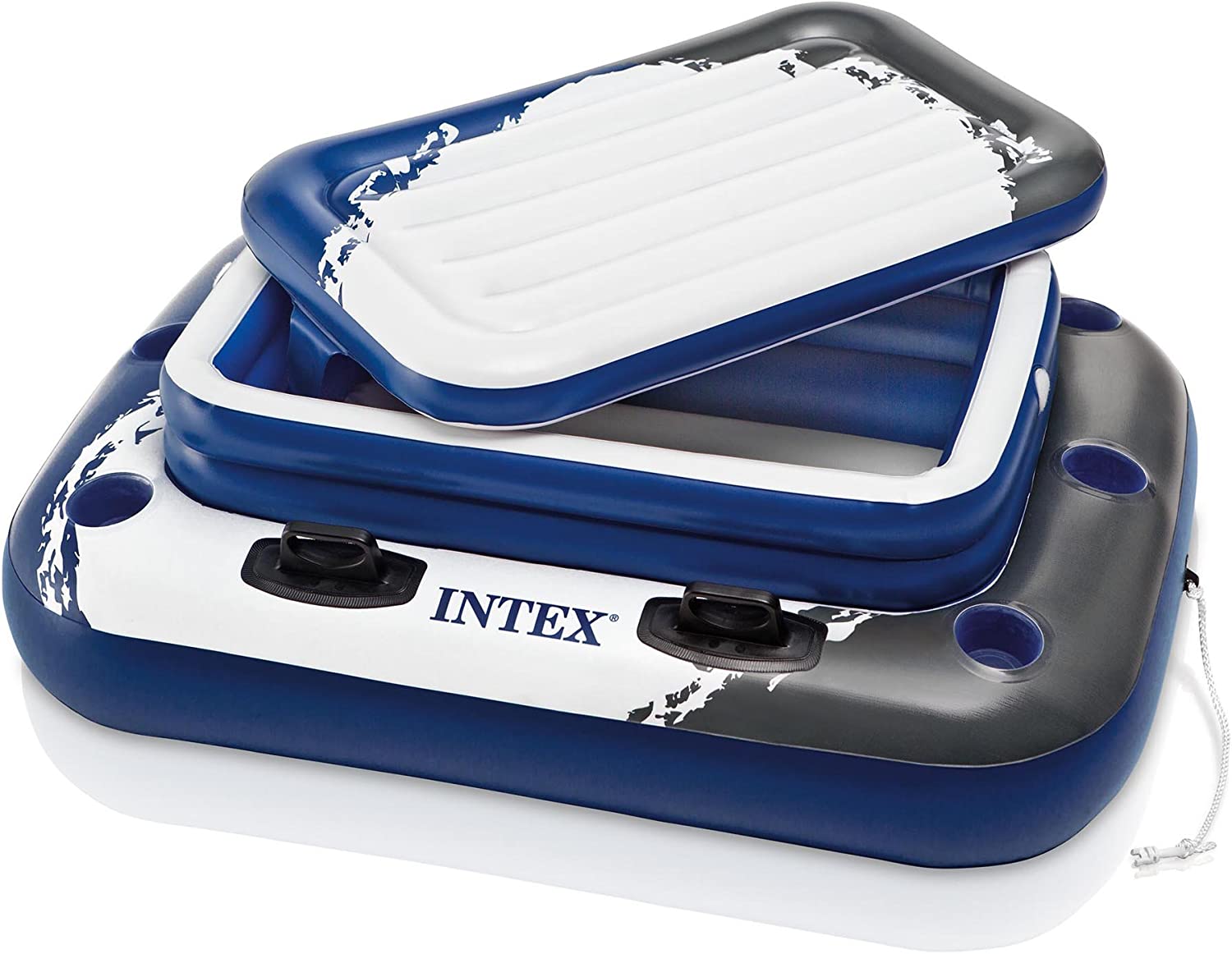 - INFLATABLE CHAIRS & COOLER: Includes 2 inflatable lounger chairs and cooler with lid; Space inside the cooler for up to 72 cans and plenty of room for ice or use as a floating base for a 48-quart cooler; Both include cup holders