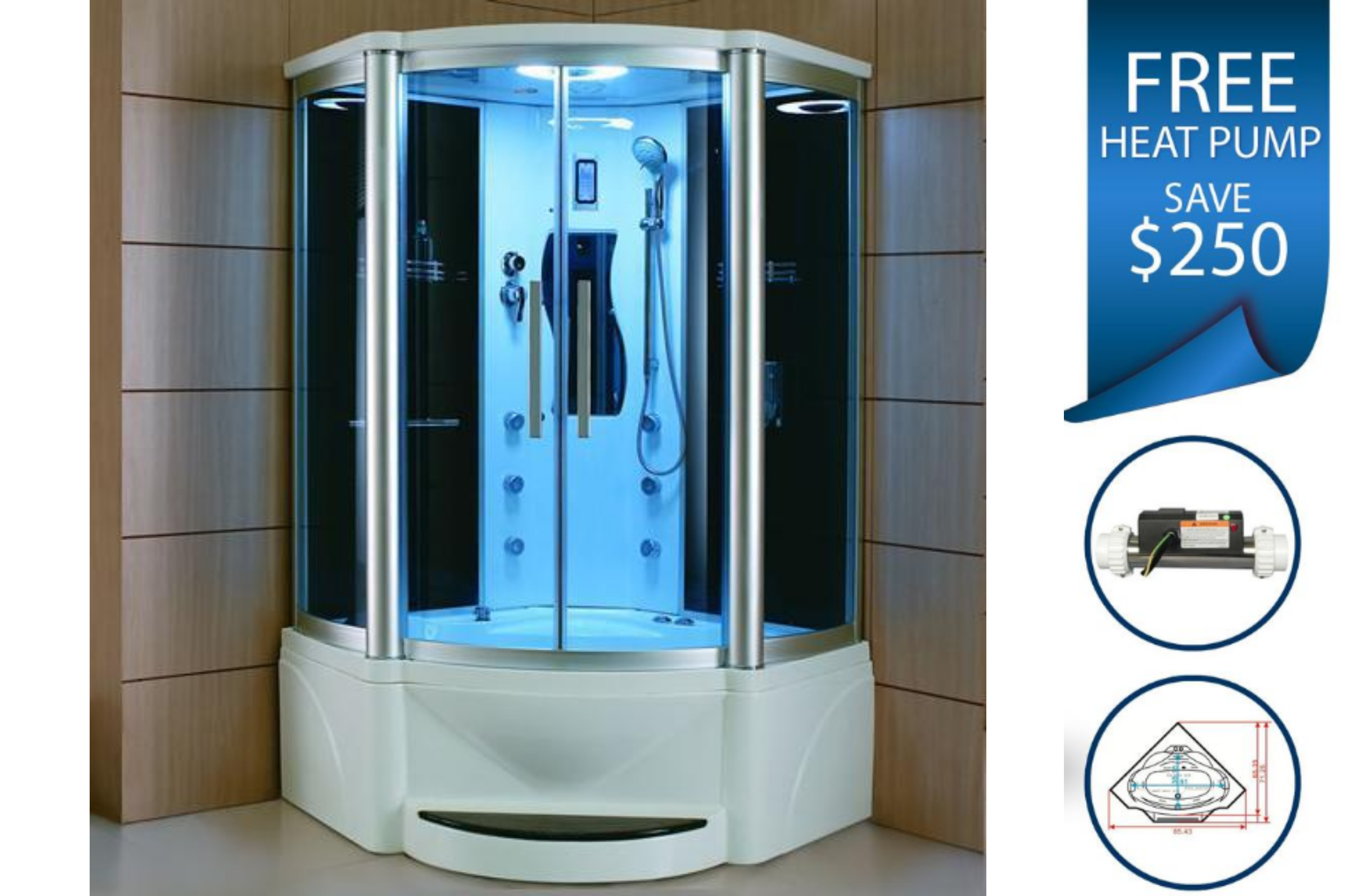 The steam generator is located underneath the tub and on certain units, it is placed on the back of the unit. All generators are mounted to the frame or screwed to the back of the unit so that they do not take up a room beyond the dimensions of the shower. All of the steam showers will sit flush against the wall.